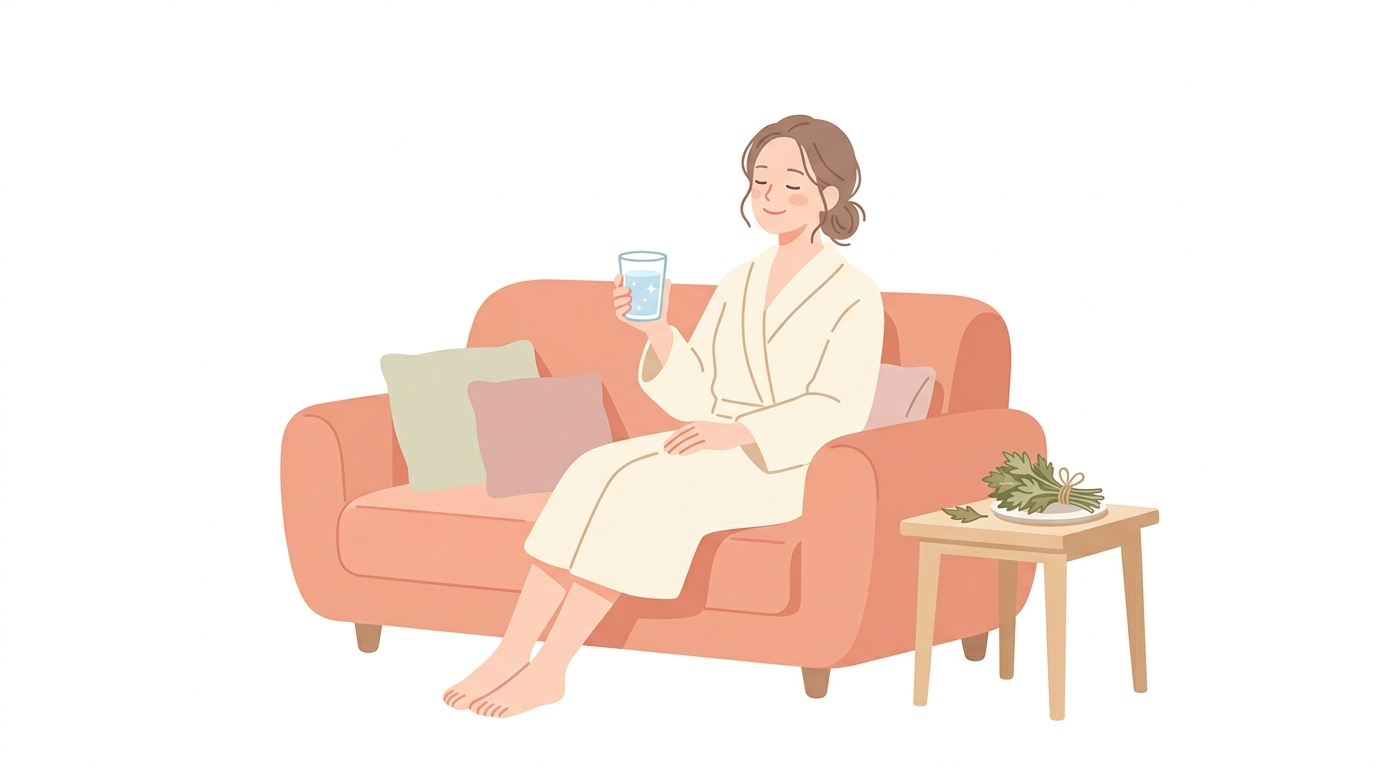 よもぎ蒸しの前後には水や白湯を飲むのが基本で、体を冷やさず内臓を温める白湯は特におすすめ。