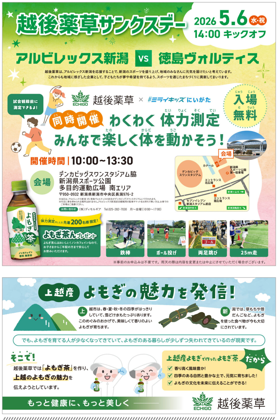 この度、2026年5月6日(水・祝)にトレーニングウェアパートナーとして応援しているアルビレックス新潟のホームゲーム(対 徳島ヴォルティス)にて、「越後薬草サンクスデー」を開催いたします。
